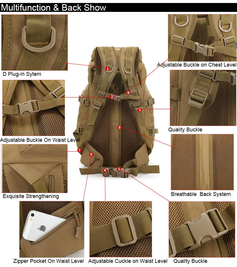 Usage: Multifunctional Backpack,Shoulders,Hiking,Fishing,Travel,Camping,Waterproof, Outdoor Sports Bag , Camouflage Molle Tactiacl Rucksack Mountain Climbing Travelling Luggage Bags